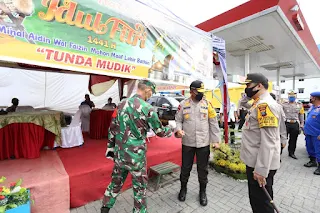 Kunjungan ini dilakukan selain untuk pengecekan juga untuk memberikan semangat kepada personel yang berjaga. Hingga saat ini sudah ada 800 kendaraan pemudik yang kita putar balik ke wilayahnya masing-masing dan tidak menutup kemungkinan akan bertambah jumlahnya tergantung dari kedisiplinan masyarakat", ujar Kapolda Sumut