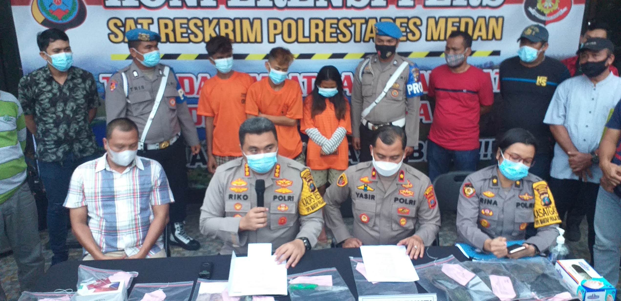 Kapolrestabes Medan Kombes Pol Riko Sunarko didampingi Kapolsek Sunggal Kompol Yasir Ahmadi dan Kanit Reskrim AKP Budiman Simanjuntak dalam konferensi pers di Mapolrestabes Medan, Jum'at (6/11/2020) sore menjelaskan. Ke-3 pelaku pembunuhan terhadap korban REF (18) sebelum melakukan aksinya dengan memancing korban melalui seorang tersangka wanita dan selanjutnya mengajak bertemu di Kota Binjai.
