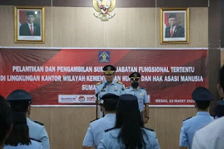 Bos com,MEDAN- Kepala Kantor Wilayah Kementerian Hukum dan Hak Asasi Manusia Sumatera Utara Imam Suyudi baru saja melantik 6 (enam) orang Pejabat Fungsional Pengelolaan Pengadaan Barang/Jasa Ahli Pertama, pada hari Rabu (23/03/2022). Dengan pelantikan tersebut, kantor wilayah semakin siap melakukan pengadaan barang/jasa dengan akuntabel dan profesional di lingkungan Kantor Wilayah Kementerian Hukum dan Hak Asasi Manusia Sumatera Utara.